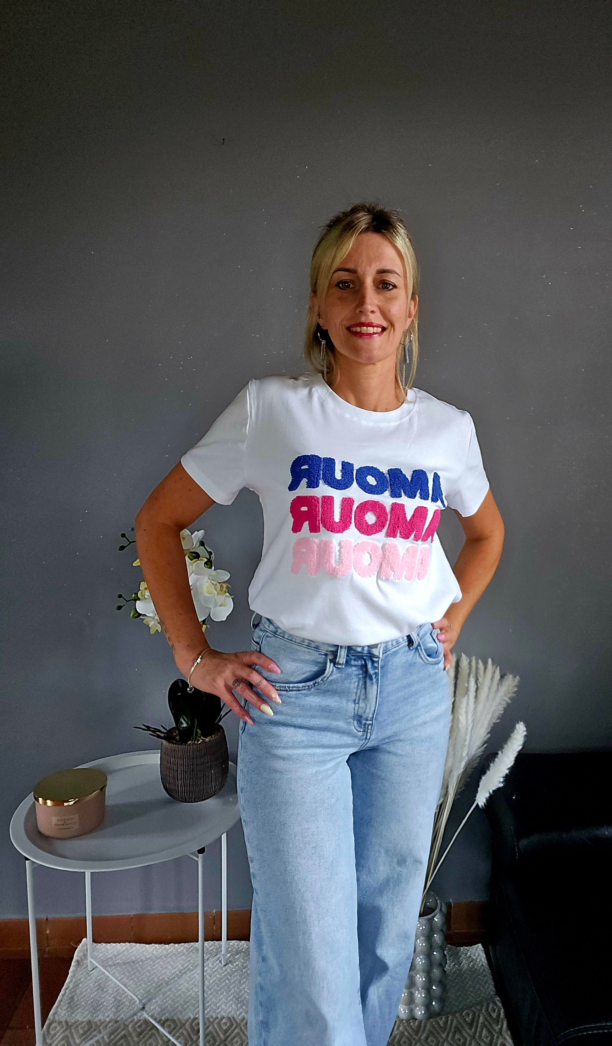 T-Shirt "Amour". Blanc/bleu royal/rose